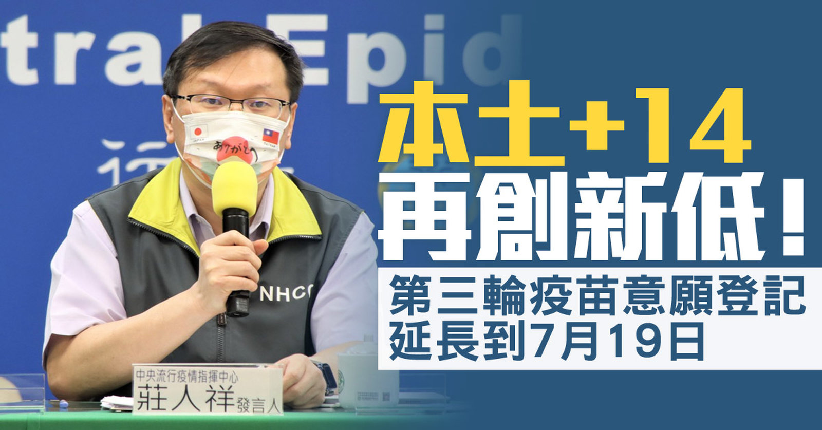 本土+14再創新低!第三輪疫苗意願登記延長到19號