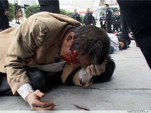 陳先生:當時18號下午他路過呢,衝出來了一群武警,就把他一頓暴打,送到醫院就縫了十幾針,滿頭滿臉都是血,現在就是局部很疼,坐也坐不著,花了很多錢,鎮的幹部來把他看了就說,你看你出了這個事情算你倒楣。