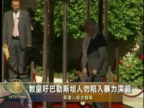 【新唐人2009年5月13日訊】羅馬天主教教皇本篤十六世星期三訪問了約旦河西岸城鎮伯利恆。教皇向巴勒斯坦人表示深切的同情和理解,同時還呼籲巴勒斯坦年輕人不要因1月加沙衝突給他們造成的痛苦而陷入暴力復仇和恐怖主義的深淵,而更要去尋求這一地區的和平。