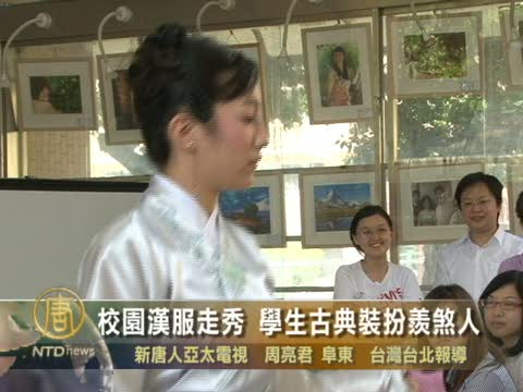 【新唐人2009年5月14日訊】12日上午,臺北商業技術學院舉辦一場別開生面的漢服走秀活動,由六位具有學校親善大使身份的女同學,在通識課程與校園裡走秀,展現傳統漢服之美,現場師生對平日活潑俏麗的模特兒們,表現出溫柔婉約的古典氣質羨煞不已。