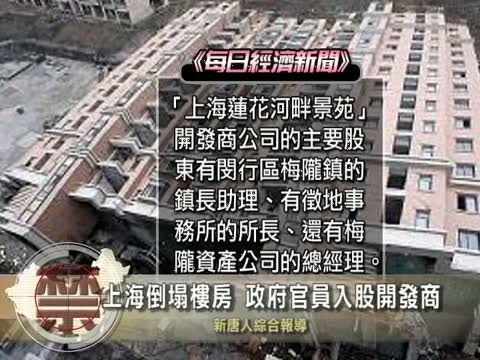 【新唐人2009年7月3日訊】上海市閔行區「蓮花河畔景苑」13層建築樓房連根斷裂,樓塌後,傳說有9名主要負責人被控制起來﹔而開發商公司股東名單也被網友「人肉搜索」出來。其中幾名股東的名字正好與當地鎮政府官員相同。