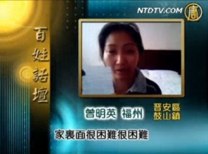 曾明英的冤屈:四次被拆遷 上訪被勞教主播:觀眾朋友們大家好,百姓話壇節目又與您見面了。福州市晉安區政府《2008年治安綜合治理工作總結》中有這麼一段話:“說是拆遷工作也遇到部分阻力,如林旭光等2戶提出溫福鐵路拆遷“五證”不齊全,屬非法拆遷,征地拆遷範圍擴大,土地賠償款上級補償15萬,到村一級只餘下了7.5萬,被挪用,雖經過反覆說明,仍然堅持已見,拒絕拆遷,這個文件還說林旭光多次到省、市、區有關部門上訪,並多次鼓動組織有關人員進京上訪,給社會造成不良影響,林旭光被公安機關給予勞教一年處分。”這個文件說的林旭光是一位有語言障礙的殘疾人,家中有兩個孩子,原本與妻子曾明英一起經營一家食品雜貨店。馬到底是甚麼樣的冤,使得他放著舒服的小日子不過,一個勁的上訪,以致還被政府勞教了一年呢?妻子曾明英向我們講述了他們的經歷。曾明英:被強拆了四次.現在是生活沒地方,家裏面很困難很困難。但我們那邊政府都沒有從來都沒來關心過。主播:林旭光雖然有語言方面的缺陷,但是為人勤快,和妻子曾明英一起,把小店舖經營的是有聲有色。曾明英:在這樣以前我們夫妻,我老公是殘疾人雖然他是殘疾人我一天在店裡面都要16給小時,我老公就去拿貨,我都是用一個本子他因為說話殘疾語言就是講話不能溝通的,我就說寫到那個本子上面然後就叫他去拿貨,他就一樣一樣的拿回來,我們辛辛苦苦的做了十幾年的店面就這樣子,就是賣吃的啦還有用的啦也賣一點,米呀麵條甚麼都有賣的,等於像小百貨店一樣甚麼都有賣,這個就是我以前那個店,我店面是這樣子的,無憂無慮的,也不是說很那個,但是我們可以吃穿不用愁。主播:2006年當地政府以溫福鐵路拆遷拆遷為名,強行用超低價收購林旭光曾明英的店面和住房。曾明英:這個是店,這個店面跟我2006年被強制拆掉的就是溫福鐵路的,這張也是溫福鐵路的。你看一下這個是溫福鐵路那個賠償方案,你看一下,我店面差一點53個平方只賠了我2萬多塊錢,我房子是差一點點240麽,只賠我8萬多塊錢,安置房買30平方都買不到。我跟你說他們的安置房,一平方是2900多,我們這裡就是240個平方差一點麽,240個平方只賠了8萬多塊錢,你說差距有多大,市場價我們那邊要四千多了現在,像我們那樣子的商品房,要4千2了。市場價我那房子肯定,就是說一平方,要50幾萬,60萬吧。主播:在當地政府沒有與被拆遷戶簽署任何補償協議的情況下,林旭光曾明英的店面和住房於2006年12月被強行拆除。曾明英:溫福鐵路就是說貼出來,沒有達到任何的協商,完了他就給你拆掉了,沒有達到任何的協議甚麽都沒有簽,他就給你拆了。一分都沒有甚麼都沒有給你協調,就這樣給你拆掉了。拆的那天,就是一大批人4,5百人就是直接到來到我房子那裏去,然後我婆婆還在家裏,他就家裏牆都鉤下去,鉤了,然後有人就說,裡面還有人啊,你都鉤下去。我婆婆還在裡面,然後才被救出來的,不然我婆婆都被壓死在裡面了。我那個婆婆腳痛嘛,然後不方便嘛,他們進去給我就是,也不管裡面有沒有人,就是先給你鉤,還好那天人多,不然我婆婆已經壓死在裡面了。主播:現在這段錄像就是當時拆遷現場的情景。曾明英還提到,本來按規定,因為修筑溫福鐵路被拆遷的人家有155戶,但是最終被拆遷的卻有311戶,多了一倍。曾明英:不懂嘛,老百姓就是不懂,開始被它們騙的騙了,沒辦法,又是恐嚇,又是那個的,有的老百姓實在沒辦法就只有這樣簽掉了,就是吃虧也是簽掉了,就這樣子,所以說我吃虧太厲害了,所以說就這樣子,就是簽不下來,才變成這樣子,這個都是政府逼著我們走這條路主播:曾明英的丈夫林旭光雖然口不能言,但是心裡有數,自己的房子被拆了至今沒有任何賠償,政府這樣做,不就是等於明搶嗎?為了一家人的生計,他走上了去北京的上訪路。曾明英:這個是我老公的相片,他是殘疾人,也是上訪到處都是上訪去過,始終得不到解決。現在連家都不敢回。被他們強制拆掉以後,我老公就去上訪嘛,上訪他就怕我們,去上訪然後就把我公無緣無故抓進去,關勞教關了一年。八月十八號晚上被抓了,就是2007年8月18號,就是跟綁架一樣,到晚上到朋友家去玩釣魚回來,騎的摩託車,在路上十幾個二十個人就把他攔下來像綁架一樣的綁著無緣無故的。就這樣抓進去關了一年勞教,我們還以為這個人怎麼回事呢,找不到人,都兩三天瞭然後我們村裡保安隊長就來跟我說,你老公被晉安區抓了那個武警隊抓了,我說無緣無故我老公犯了甚麼罪被抓了,就是這樣子所以我也是去北京為了我老公這樣子也上過訪,上過很多部門,省市的還有區的都去上過,所有都沒有得到解決,然後我老公被無緣無故關了一年有後現在回來也已經一年了,沒有達到任何的協商也沒有任何解決的方法。主播:2009年5,6月間,當林旭光還在北京為自己的住房問題上訪的時候,家鄉的祖傳老宅又突遭當地政府強拆,據村民透露,強拆隊伍龐大,約有三、四百人的。目前林旭光和弟弟林旭強已無家可歸。曾明英:這個就是我老宅的大門被他們無緣無故的敲掉的,這張沒有我們任何同意把我那個房門拆掉就是這樣子,這平方量去了,把我家裏面的很多財物也給我搞的都沒有了,起碼兩百年以上了,祖祖輩別已經很早很早的房子,老宅也是被他們今年5月23號被強行拆掉的,這張是今年2009年6月11號也是我爺爺解放以前的房子,總共是五層樓