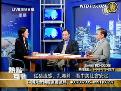 【新唐人2009年10月7日訊】主持人:各位觀眾朋友大家好,歡迎收看新唐人電視台《熱點互動》欄目熱線直播節目。每個人都希望有個和平安定的環境,不過這個世界總是不太平。在甲型流感在全世界漫延的時候,美國居高不下流感的病歷也越來越高。不過好在從昨天開始,美國已經開始了大規模的疫苗接種行動,美國政府也購買了2億5千萬劑的疫苗,免費提供給民眾使用。那麼在中國的民眾就沒有這麼幸運了,現在甲型流感已經在學校大規模、大範圍的開始流行和蔓延,很多學校因此停課和封校。前不久在新疆出現了扎毒針的現象,在最近也蔓延到很多省市,引起人們的恐慌。兩相比較,有意思的是,能夠讓人生命受到威脅的甲型流感,卻沒有引起很大的恐慌。我們今天要討論的是在中國和在美國,兩個社會都存在不安定因素的情況下,哪一個社會讓您更有安全感?歡迎您打我們的熱線號碼6465192879,您也可以通過skype和我們連繫,skype地址是RDHD2008。首先向各位介紹現場的兩位來賓,這位是新唐人特約評論員陳志飛教授。陳教授您好!陳志飛:大家好!主持人:另外一位是新唐人特約評論員橫河先生,橫河先生您好!橫河:安娜妳好!主持人:我們首先請橫河先生給我們觀眾朋友介紹一下,現在甲型流感在全球蔓延的情況。橫河:甲型流感從4月份開始在墨西哥被確認以後,很快的到達美國,之後再流傳到全世界各個國家。後來世界衛生組織因為病例太多,已經停止追蹤個別病例,不再統計現在有多少病例了,只統計哪個地區集中爆發。再一個是統計死亡人數,現在全球死亡人數有四千五百多人。按照各個國家報的案子現在看來,中國上報的是2萬1千例左右,死亡1例;美國上報的是5萬2千例,死亡847例;香港是2萬7千例,死亡是28名。這個差別有點大。現在流感最擔心的是在春天來一波,然後在夏天就開始消失了,再到冬天再來一波,所以現在世界衛生組織和CDC(美國疾病防治中心)都預測,全球大爆發最可能在冬季的中間時間,可能會全球爆發。現在人們最擔心的就是全球爆發,因為這是一個比較新的流感病毒,所以大家不能預測它突變的過程和速度。因為它是由1個人的基因,1個鳥的基因和2個豬的基因組成的這麼一個病毒,大概的情況就是這樣,所以人們都在準備著冬天這一波。據說現在中國大陸爆發的和美國的一些案例,被認為已經是第二波的了。主持人:從您說的這個情況,至少已經有好幾千人死亡,而且多少萬人感染了病例,還有很多感染了可能都沒有統計,應該說是一個比較嚴重的流行性瘟疫也好或者感冒也好,而且對人的生命直接造成威脅。可是有意思的是,也是很奇怪的現象,就說像在中國已經很蔓延了,在美國也是病例居高不下的情況下,為什麼人沒有那種恐慌感呢?陳教授。陳志飛:這有幾個原因:第一,我覺得相比幾年前的SARS,好像人們對於突如其來的大瘟疫或者大的病毒已經有所準備了,不像在SARS剛出現的時候,大家好像覺得在鼠疫病消失很多年後,第一次有可能對人類造成威脅的傳染病。我也不是專家,但是在這之前包括我們這些沒有多少醫學知識的人,都覺得這種病毒好像已經被科學完全克服了,這種病毒能奪去多少生命是遙遠歷史的事情,如1918年的大瘟疫一樣,現在科學已經不會再有這種事情發生。在SARS之後再次出現這樣的事情,人們已經有所準備了。另外一個,美國科學家發現,雖然這種病毒的擴散性非常強,但是它造成的死亡,可能並沒有一般美國冬天的傷寒病造成的死亡人數多,所以它的症狀被證明還是比預期想像的要輕微一些。所以現在在更多的壞消息被報導出來之前,大家還在拭目以待,好像沒有亂了陣腳。主持人:我記得當時SARS爆發的時候,很多國家都非常的緊張。我們知道美國從一開始就比較透明的告訴你哪兒發生病例了,讓大家注意什麼,媒體也報的比較多。在中國一開始是蓋著的,是不讓大家知道,為了所謂的「社會穩定」是不讓人家知道。後來蓋不住了,因為它如果不告訴真實情況,還會影響其它的國家,整個會造成國際影響,後來又報了。報了之後中國老百姓就很緊張,大家都戴著口罩,互相不來往,比較恐慌。那麼在這一次甲型流感的蔓延和流行之中,您覺得中國政府和美國政府,兩個政府採取了什麼策略和措施呢?橫河:一個就是告訴大家流感是怎麼回事,這點大概沒有什麼大的差別。流感不引起恐慌的另一個重要原因就是,人們認為流感不是什麼很嚴重的病,每年反正都來,今年只不過換了一個花樣。而流感每過幾年就有一次大流行,人類好像已經習慣了,而SARS當時出來的時候是死亡率特別高,高傳染性,高死亡率。而這次在很多國家死亡率不是這麼高,在中國當然有點低的可疑,但德國也有類似的數字,也是2萬多人感染、1人死亡。所以會不會是這個因素。另外一個就是發展疫苗,中國是世界上第一個聲稱製造出能夠應用這次甲型流感疫苗的國家。主持人:但是後來,我記得發明的人說他所說的疫苗不是針對這個H1N1甲型流感的,是不是?橫河:不是,是最近宣布的,是針對這一次的,不是原來那一次。而且他提前宣布用一支就可以了。後來澳大利亞經過臨床實驗,也認為不用打兩次,打一次就可以了。主要我覺得這兩個國家的差別在於哪些人群,因為現在來不及製造給所有的人群都做,所以只能集中在重點人群裡面。在美國是確定6個月到4歲的兒童,還有醫務工作者,以及看管6
