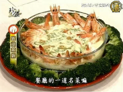 【新唐人2009年10月8日訊】上海風味的銀湖蒸蝦其實許多平凡的家庭主婦往往有一些深藏不露的絕活兒,今天所要為您示範的這道「銀湖蒸蝦」正是月珍媽媽自己研發的料理。光看菜名就很有名廚氣勢,把蒸蛋想像成湖泊,上面有著悠游的紅蝦子,是一道兼具色相、賣相的佳餚。首先把打好的蛋先蒸一半,約莫三分鐘後接著將蝦子立於蒸蛋上,再將剩下的蛋液倒入,續蒸五分鐘。空檔時可將綠花椰菜汆燙擺盤,待蒸蛋蝦子熟後置於其上,即完成這道「銀湖蒸蝦」。月珍媽媽還會在節目中教您如何做煎餃喔,請準時收看珍饌。