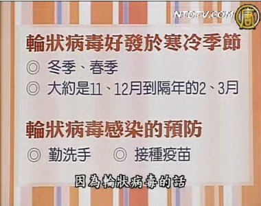 冬天造成腸胃炎最常見的原因就是輪狀病毒,它比較容易侵犯在兩歲以下的小朋友。輪狀病毒它是在1972年的時候有一個澳洲的醫師在一個嚴重腹瀉的小男孩的糞便的檢體上,在電子顯微鏡下看到一個很像輪子的病毒就把它取作為輪狀病毒。