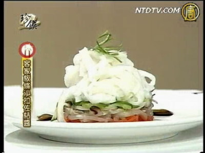 【新唐人2009年12月31日訊】珍饌(21):客家板條沙拉佐桔醬 ”淡淡的油蔥味 回甘無窮的感覺” 一樣是客家料理但是今天介紹的是輕食,像涼麵一樣的沙拉菜。雖然是輕食,其中的顏色可是蘊含著中國古老的「五行」智慧喔!像「紅」蘿蔔、「綠」色小黃瓜、「黑」香菇、「銀」芽。此外,這道客家板條最特別的是醬料的調製:桔醬、橄欖油和蔥油。最後再提醒你,上桌前的擺盤工夫也要學一學……