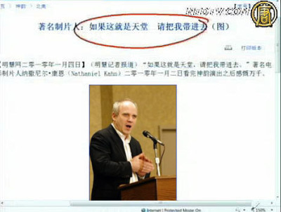 【新唐人2010年1月6日訊】神韻藝術團周末在底特律、費城和舊金山三地同時演出,好戲連場。兩度提名奧斯卡的美國知名導演納撒尼爾・康恩(Nathaniel Kahn)在費城看完神韻表演之後,深受觸動。他激動的表示:「如果這就是天堂 請把我帶進去。」