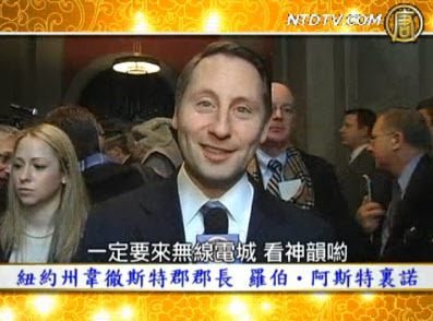 【新唐人2010年2月2日訊】紐約州韋徹斯特郡長羅博·阿斯特里諾(Rob Astorino)新年問候,向大家拜年:虎年好!一定要來無線電城看神韻喲!