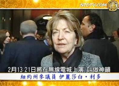 【新唐人2010年2月2日訊】紐約州參議員(Betty Little)賀華人新年2010年新年伊始,我祝願每個人新年快樂,欣欣向榮。今年是中國的虎年,我希望我們很本著虎的精神知識豐富,不斷前進,努力工作,使情況在2010年得到改觀。我還要向您推薦一場美妙的演出《神韻》,2月13-21日將在無線電城上演。我願現在在電視機前的每一位觀眾,如果你在紐約都能到無線電城觀賞《神韻》的演出。