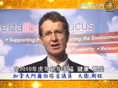 【新唐人2010年2月11日訊】加拿大阿爾伯塔省議員、官方反對黨領袖、阿爾伯塔省自由黨領袖大衛·斯旺:我非常榮幸的祝全球華人,在2010年虎年,新年幸福、健康、繁榮。新年快樂!