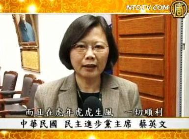 【新唐人2010年2月13日訊】中華民國民主進步黨主席蔡英文新年祝賀新唐人電視台的觀眾朋友在新的一年,我們祝大家新年快樂,而且在虎年虎虎生風,一切順利。