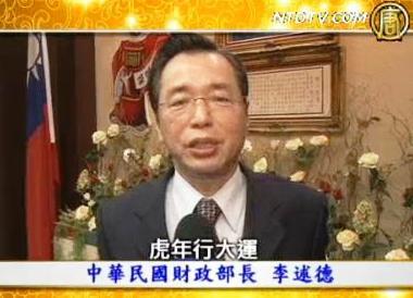 【新唐人2010年2月13日訊】中華民國財政部長李述德新年賀詞我想藉這個機會跟我們所有觀眾拜個年,祝大家虎年行大運,大家都心想事成。