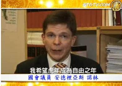 【新唐人2010年2月15日訊】瑞典國會議員Andreas Nolin賀華人新年大家好,我叫安德裡亞斯.諾林,我是瑞典國會代表保守黨的議員,我祝中國人民新年快樂、虎年快樂,我希望虎年成為自由之年,中國人民能和我們瑞典人民一樣,都享有信息自由、文化自由、言論自由。
