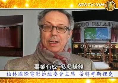 【新唐人2010年2月16日訊】德國柏林國際電影節組委會主席Kosslick賀年親愛的新唐人電視台的觀眾朋友們,我衷心祝願你們在新的一年,也就是農曆的虎年事業有成,多多賺錢。