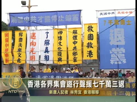 【新唐人2010年3月15日訊】香港各界人士星期日舉行“解體中共、救國救港”聲援七千萬勇士退出中共的集會及遊行活動。全球退出中共服務中心主席高大維指出,退黨大潮勢不可擋,呼籲更多人參與。多位政界名人也表示,七千萬人退出中共,反映中國人民不斷覺醒,也像徵中共已經瓦解,即將倒臺。