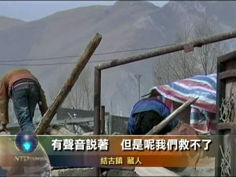 【新唐人2010年4月20日訊】中國玉樹地震進入第五天,據官方數據,截至4月19日晚20時,玉樹地震遇難人員已達到2039人,失蹤195人,受傷12135人,其中重傷1434人。目前,重災區結古鎮已經停止搜救,當地倖存者透露這兩天廢墟裡還傳出呼救聲,都沒人去救,災民得不到救濟,吃住成問題。現場救援人員也表示,救災物質特別缺乏。