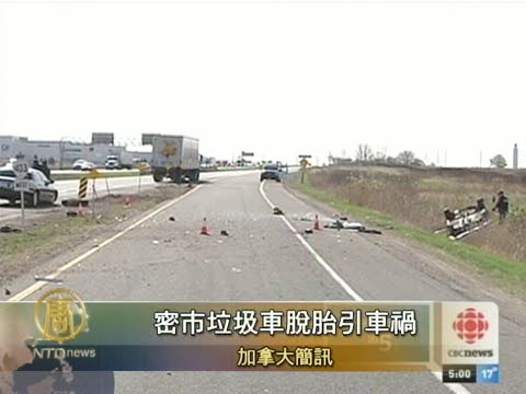 今天凌晨,密西沙加市發生了一起嚴重的車禍,一輛垃圾車在403高速靠近Dundas路段時突然脫胎,砸到了後面的一輛車,結果導致該車失控,翻滾到旁邊的路溝中,男性司機嚴重受傷,被空運到醫院急救。但該垃圾車司機並沒有意識到這一點,繼續前行,而後另一隻輪胎也脫落,砸到了另外兩部車,幸運的是沒有人員傷亡。但導致高速關閉了大約5個小時。