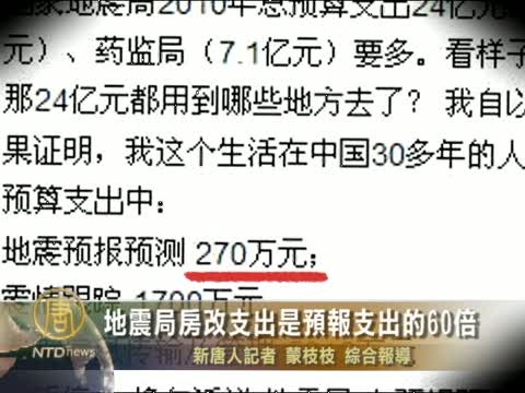【新唐人2010年4月23日訊】根據中國中央政府網公布的數據,國家地震局2010年地震預報預測支出為270萬元,不到地震局房改花銷的2%。地震局財政支出分配的合理性近日引起網民熱議。