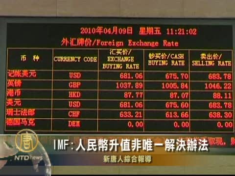 【新唐人2010年4月30日訊】國際貨幣基金組織週四在上海發表了一份區域經濟展望報告,說人民幣被低估了,但升值並不是唯一的解決辦法。他呼籲中國實施一系列改革來解決人民幣問題。