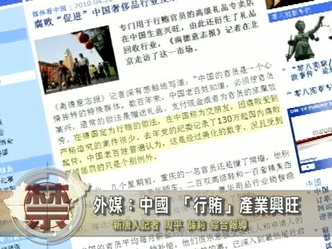 【新唐人2010年4月30日訊】專門用於行賄官員的高級禮品專賣店,在中國生意興旺,由此還衍生了禮品回收行業,《南德意志報》記者在北京走訪了這一市場。而外國企業在中國為了取得合同或執照,也入境隨俗的捲入了“行賄”的不歸路。請看以下報導: