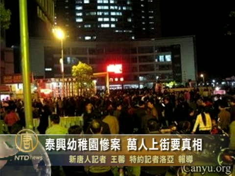 【新唐人2010年5月3日訊】江蘇泰興幼稚園喋血案,究竟有多少孩子死亡?仍然是個謎團!中共中宣部因為世博會,甚至要求對該事件低調處理,媒體被噤聲,醫院還不允許家長見危重孩子,心急如焚的家長及市民星期五晚上走上街頭髮出不滿的吶喊。