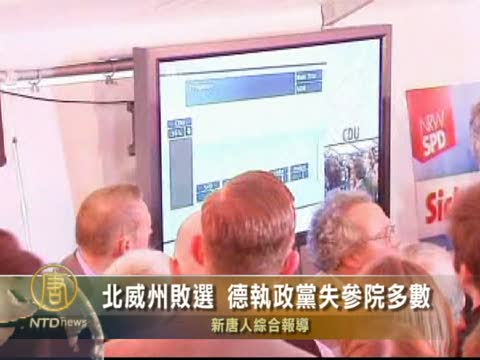 【新唐人2010年5月10日訊】對德國政壇具有舉足輕重影響的北萊茵-威斯特法倫州(北威州)議會選舉週日晚結束。初步計票結果顯示,總理默克爾的中間偏右執政聯盟遭遇慘敗,從而失去了在議會上院---聯邦參議院的多數地位。