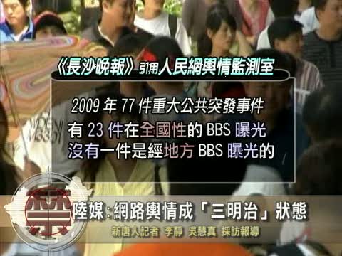 【新唐人2010年5月12日訊】最近,大陸有媒體把目前中國的網路形容為“三明治”,大部分重大事件在中央媒體和全國性網路論壇上曝光,而事件發生地的媒體和網路論壇則受到地方政府控制,有關的消息被封鎖。分析人士指這種現象的存在根源於中國的現行制度——一黨專制。
