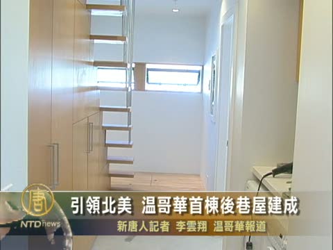 【新唐人2010年5月13日訊】溫哥華市政府作了一項調查,發現獨立屋70%的車庫都沒有用來停車。那麼如果把這個空間用來蓋房子,可能是緩建住房問題的好辦法。下面請跟隨本臺記者去看一看溫哥華第一棟後巷房屋。