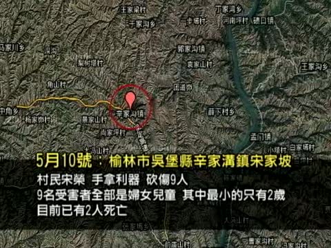 據中國新聞網報導,5月10號,榆林市吳堡縣辛家溝鎮宋家坡村民宋榮,手拿利器,砍傷9人。9名受害者全部是婦女兒童,其中最小的只有2歲。目前,已有2人死亡。