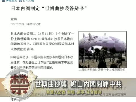 【新唐人2010年5月13日訊】今年4月,上海世博會歌曲《2010等你來》抄襲日本歌曲《不變的你就好》曝光後,中共當局並未向日本政府道歉,日本鳩山內閣要求中共改善知識產權制度等適當應對措施。