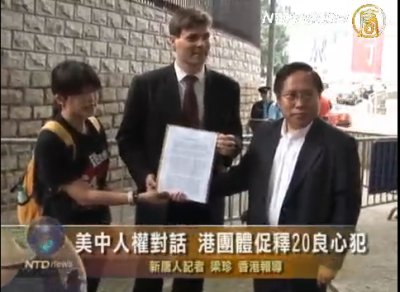 【新唐人2010年5月15日訊】就在星期四中美人權對話舉行的當天,香港多個關注中國人權的團體遊行到美國領事館,敦促美國政府向中共施壓,要求釋放包括高智晟等在內的20名在囚良心犯。