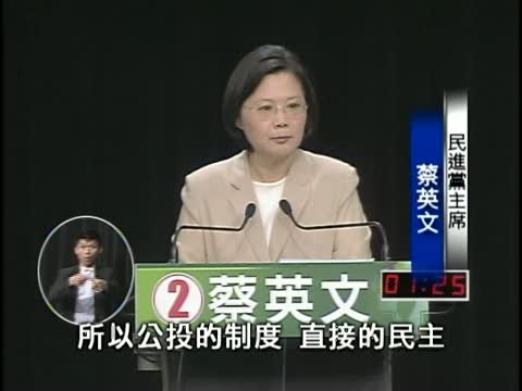 民進黨主席蔡英文:「因為台灣最後一道防線,就是我們的民主,所以公投的制度,直接的民主,是我們保有台灣主權最重要的一環,任何重大的事務要人民來決定。台灣的經濟必須要保持自主的空間。」