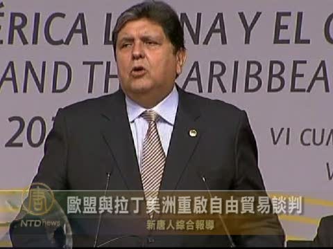【新唐人2010年5月19日訊】歐洲聯盟和拉丁美洲國家領導人星期二正在馬德里舉行高級峰會,雙方同意重新啟動陷入僵局的貿易談判,並共同努力解決其他問題。