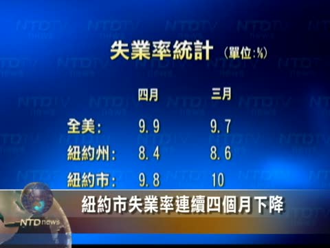 【新唐人2010年5月22日訊】四月份紐約市失業人數為39萬,失業率為9.8%,降到了2009年6月以來的最低點,低於全美9.9%的平均水平。這也是紐約市連續四個月失業率呈下降趨勢。