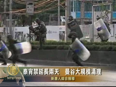 【新唐人2010年5月24日訊】泰國政府週日宣佈,將首都曼谷和其它幾個省份的宵禁令延長兩天。數千人在遭衝突蹂躪的曼谷商業區,展開大規模清理工作。
