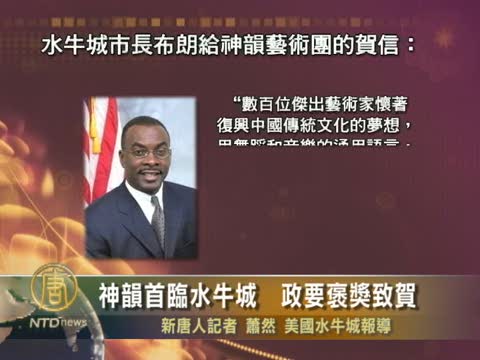 水牛城市長拜侖.布朗代表全體市民歡迎神韻藝術團的光臨:“數百位傑出藝術家懷著復興中國傳統文化的夢想,用舞蹈和音樂的通用語言,在世界頂級舞臺,向全球二十多個國家、一百多個城市的百萬觀眾呈現了天堂的美景、遠古的英雄傳奇與當代的壯麗史詩。”