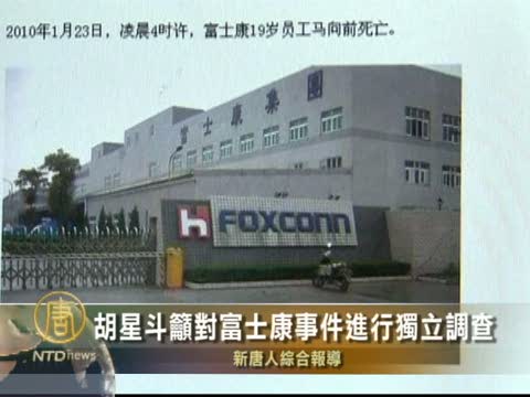【新唐人2010年5月27日訊】就在鴻海集團董事長郭臺銘到深圳富士康,應對5個月內連續11名員工跳樓自殺事件之時,26日夜間,又有第12名員工跳樓身亡。北京理工大學中國問題專家胡星斗教授認為從富士康到更高層政府都在推卸責任,他呼籲對富士康自殺事件進行獨立調查。