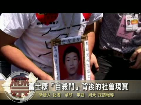 【新唐人2010年5月27日訊】富士康深圳廠區連續4個月來屢屢傳出員工跳樓事件,平均一個月就有三人跳樓,如此高頻率的「十二連跳」,到底是甚麼原因?自殺的陰影不斷在富士康蔓延,令人不得不反思這背後的社會現實。