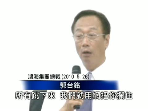 【新唐人2010年5月27日訊】富士康老闆郭臺銘,26日12個小時內奔波兩岸,安撫員工,進行危機處理,還祭出6大防跳措施,不過26日深夜,富士康深圳龍華廠區,又發生2010年以來第12起員工跳樓意外,這樣的結果,恐怕讓郭臺銘心中的壓力,越來越大。