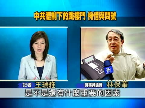 時事評論員:「我想首先政府要負責,因為中國共產黨從來就不重視人命的,校園血案,幾十個幾十個的死傷,你看到領導人有出來表示哀悼嗎,甚至於新聞都不准播,那種對生命的不重視,如果社會上都是這樣看法,對自殺者來講,他也覺得生命本來就不值得重視,這是一方面,第二方面,如果確實自殺的,那些年輕人裡面,因為過去一胎化的,你父母親都在指望你,不但父母親,可能祖父母都在指望你,但是會有這樣多的自殺,我是有懷疑,有的自殺,他本身有查到外傷,另外就是,自殺裡面,我們不太看到哪些有遺書的,所以也有人懷疑,這裡面是不是有謀殺,製造這種自殺事件,將來打擊富士康,(若是)公安跟競爭對手勾結在一起,那事情就非常嚴重,然後將來有好處大家分,這種情況在中國不是沒有過的。」