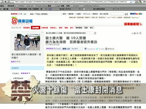 【新唐人2010年5月31日訊】深圳富士康還沒有完全平息「跳樓門」,廠內重要車間又發生了不明火災,據香港《蘋果日報》5月30號的最新報導,這場火警造成至少 10多名工人受傷、一名消防員身體不適。但廠方為了避免洩露消息,將全部傷者留在廠內的醫療室自行處理。