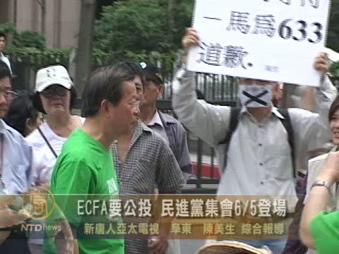【新唐人2010年6月1日訊】政府希望6月完成兩岸經濟合作架構協議ECFA的簽署,但民間反對聲浪不斷,民進黨中央也將舉辦一系列「人民要作主,ECFA要公投」的活動,預定6月5號在高雄市光榮碼頭登場,民進黨預估將有上萬民眾到場參加。