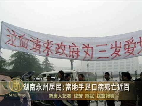 【新唐人2010年6月2日訊】湖南永州市東安縣杉木村,居民曾豔飛的三歲女兒李星星上月12日患手足口病,因醫師誤診死亡。曾豔飛透露,當地政府隱瞞疫情,導致手足口病蔓延,實際死亡病例近百人,但永州市目前只通報50個死亡病例。