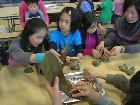學生們分成幾組,每一組的桌上都有備好的食材。疊粽葉,放入糯米﹔再用繩子綁好,你來一片,我也來一片,小小的孩子也做得像模像樣。拿起包好的粽子,在相機前擺個姿勢,留下可愛的紀念。
