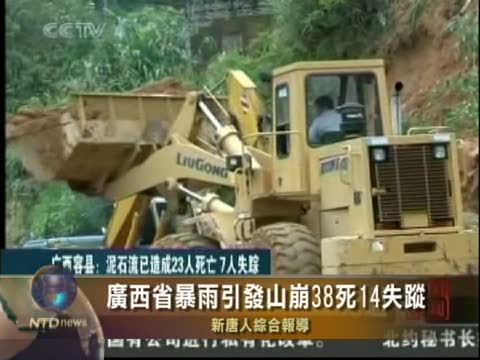 【新唐人2010年6月3日訊】廣西由於暴雨引發山崩,埋沒了房屋並阻斷了道路,截至星期四(6月3日),死亡人數已經上升到38人,還有至少14人失蹤。
