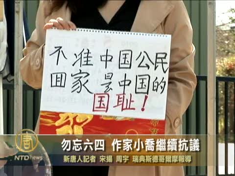 因在中國互聯網上發表過有關六四文章而得罪了中共的上海作家小喬,仍旅居瑞典。她曾多次向中國駐瑞典使館申請回國簽證,不但沒有得到答復,反被拖出使館。小喬被迫在斯德哥爾摩中國駐瑞典使館前舉牌抗議,並表示抗議將持續到六月四日,以紀念一九八九年為爭取民主而被中共屠殺的愛國學生。