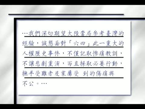 『…我們深切期望大陸當局參考台灣的經驗,誠懇面對「六四」此一重大的人權歷史事件,不僅記取慘痛教訓,不讓悲劇重演,而且採取必要行動,撫平受難者及家屬受到的傷痛與不公。…』