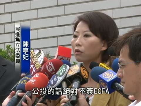 民進黨立法委員 陳亭妃:「我想昨天這樣的結果,完全是受到中國指示,接受中國的命令,因為中國早就已經說,你們絕對不能公投,公投的話絕對不簽ECFA,我們絕對會繼續,所有社會運動的路線,然後我們也不排除提出二次公投的議案。」