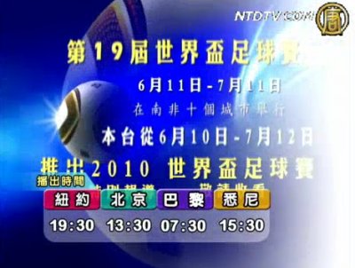 【新唐人2010年6月4日訊】本臺6月10日-7月12日推出2010世界杯足球賽特別報導。
