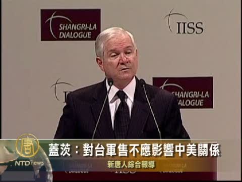 【新唐人2010年6月5日訊】星期六(6月5日),正在新加坡參加安全會議的美國國防部長羅伯特.蓋茨(ROBERT GATES)表示,中國因對臺軍售問題,而暫停中美軍事往來的做法“毫無道理”。